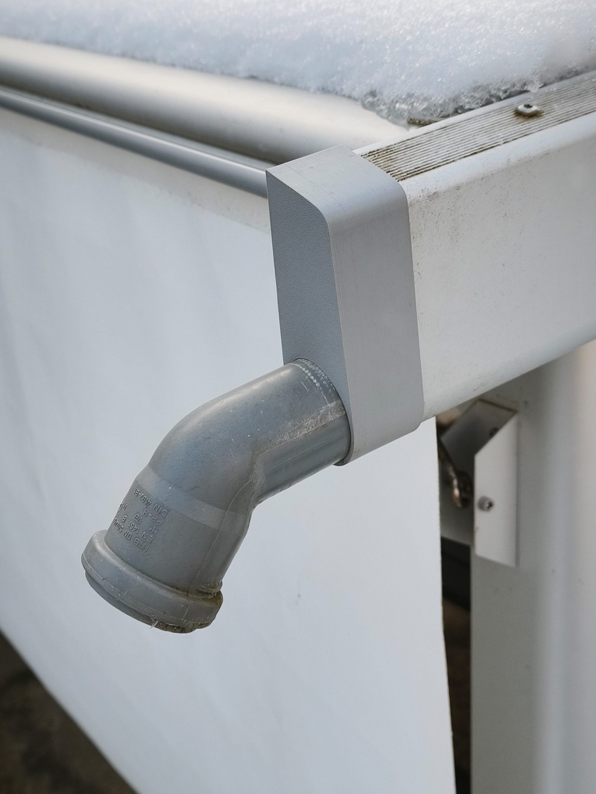 Die Endkappen werden einfach links und rechts auf die Regenrinne gesteckt. Sie sind so passgenau, dass sie ohne anschrauben halten. Trotzdem haben wir auf der Unterseite ein Bohrloch, damit man die Kappen im Bedarfsfall mit einer Schraube in der Regenrinne fixieren kann. Dazu muss man nur ein Loch mit einem Metallbohrer in die Rinne bohren und mit einer Blechschraube die Kappe festschrauben.